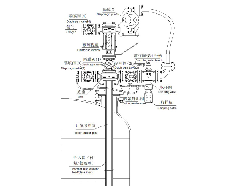 太極反應(yīng)釜在線(xiàn)自動(dòng)取樣系統(tǒng)(AUTOMATIC SAMPLING SYSTEM)為防腐在線(xiàn)取樣裝置。取樣物料接觸各部件均采用里襯PFA、襯氟材質(zhì),達(dá)到防腐目的;四氟吸料管配套插入管(襯氟/搪玻璃材質(zhì))浸于釜內(nèi)料液以下,增加其過(guò)程的穩(wěn)定性。隔膜泵以潔凈壓縮空氣為動(dòng)力,物料在取樣系統(tǒng)中形成閉環(huán)循環(huán)回路,過(guò)程快捷、安全、無(wú)污染。