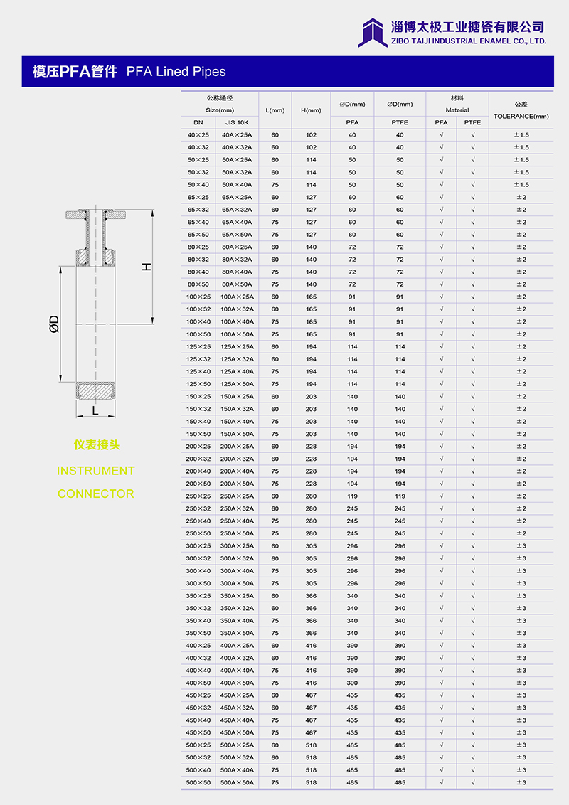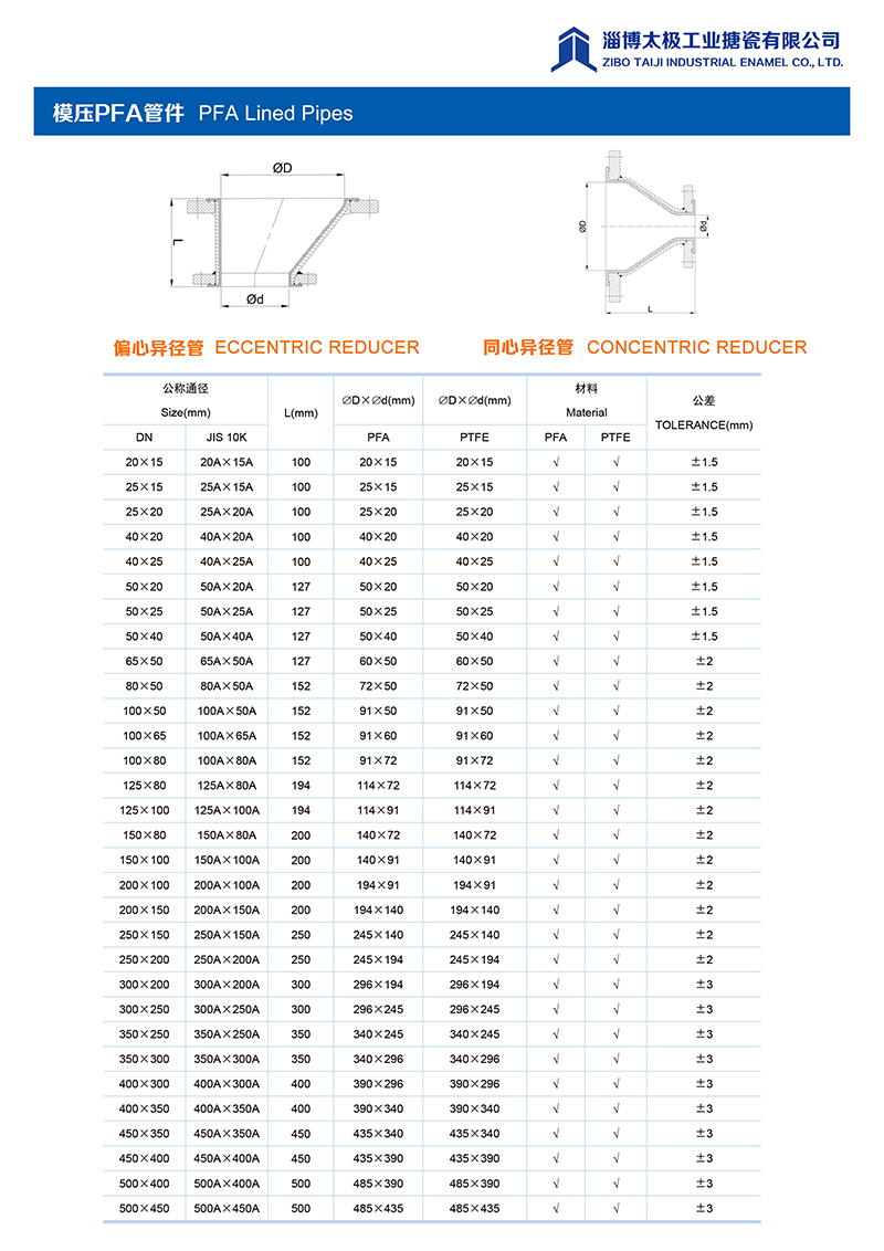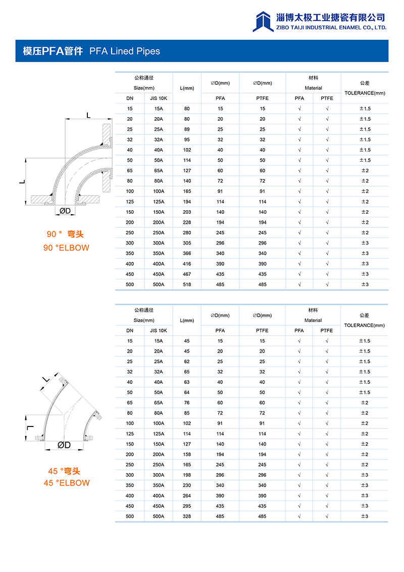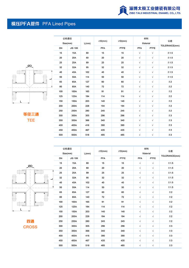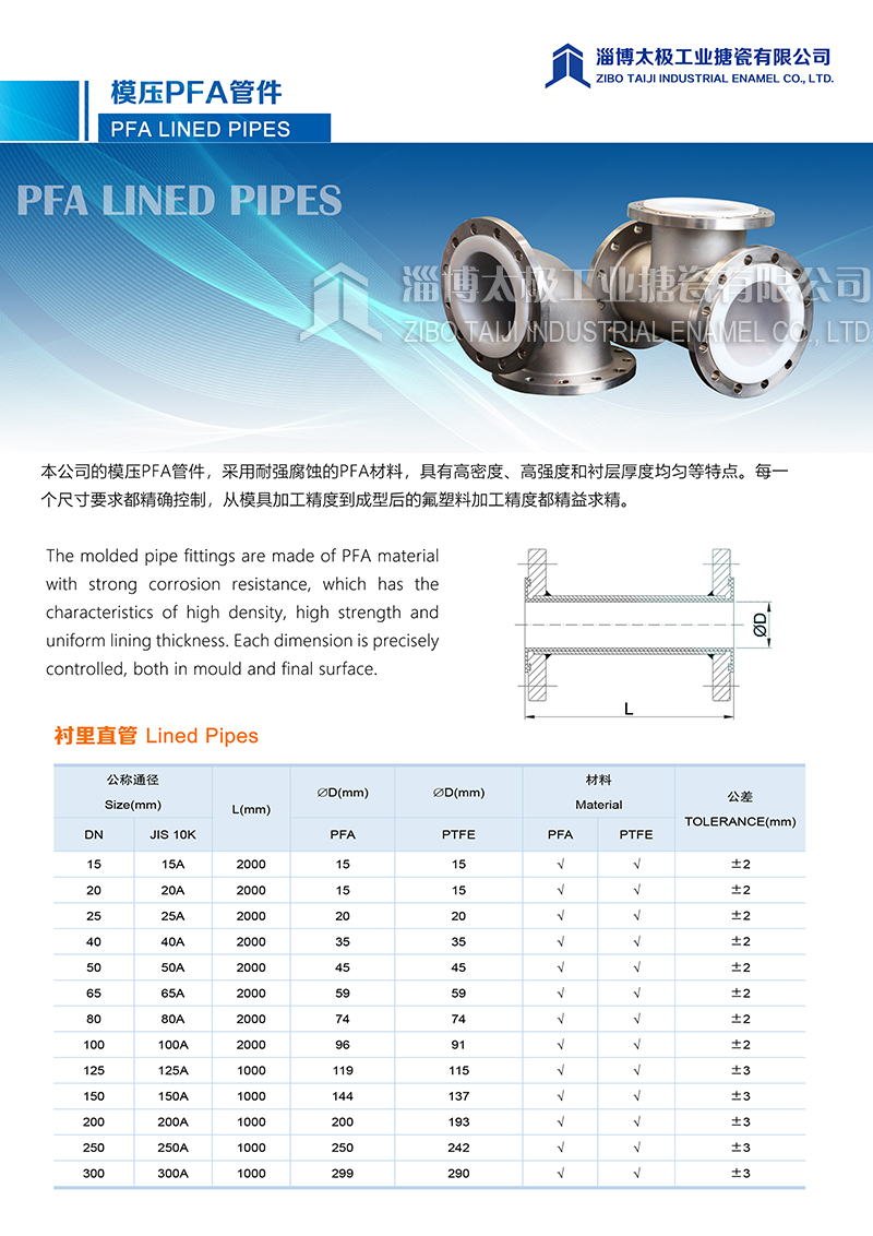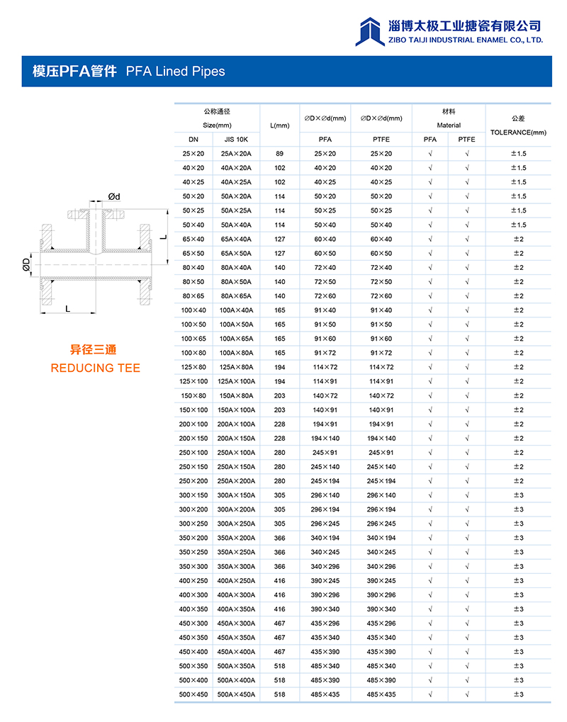 本公司的模壓PFA管件,采用耐強(qiáng)腐蝕的PFA材料,具有高密度、高強(qiáng)度和襯層厚度均勻等特點(diǎn)。每一個(gè)尺寸要求都精確控制,從模具加工精度到成型后的氟塑料加工精度都精益求精。